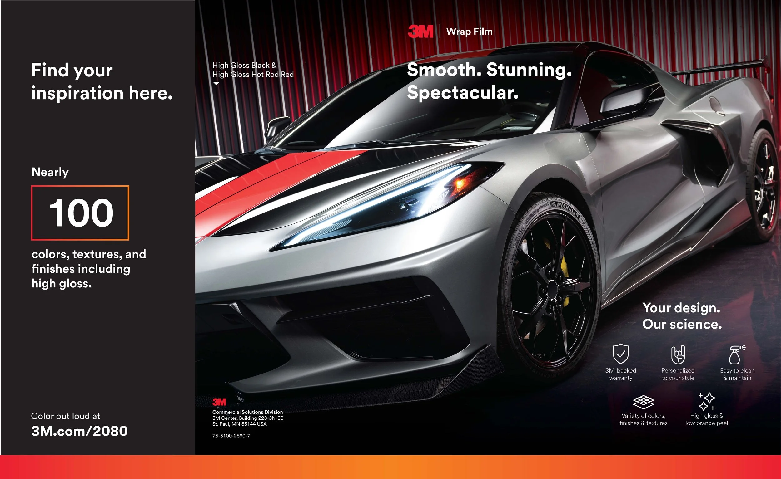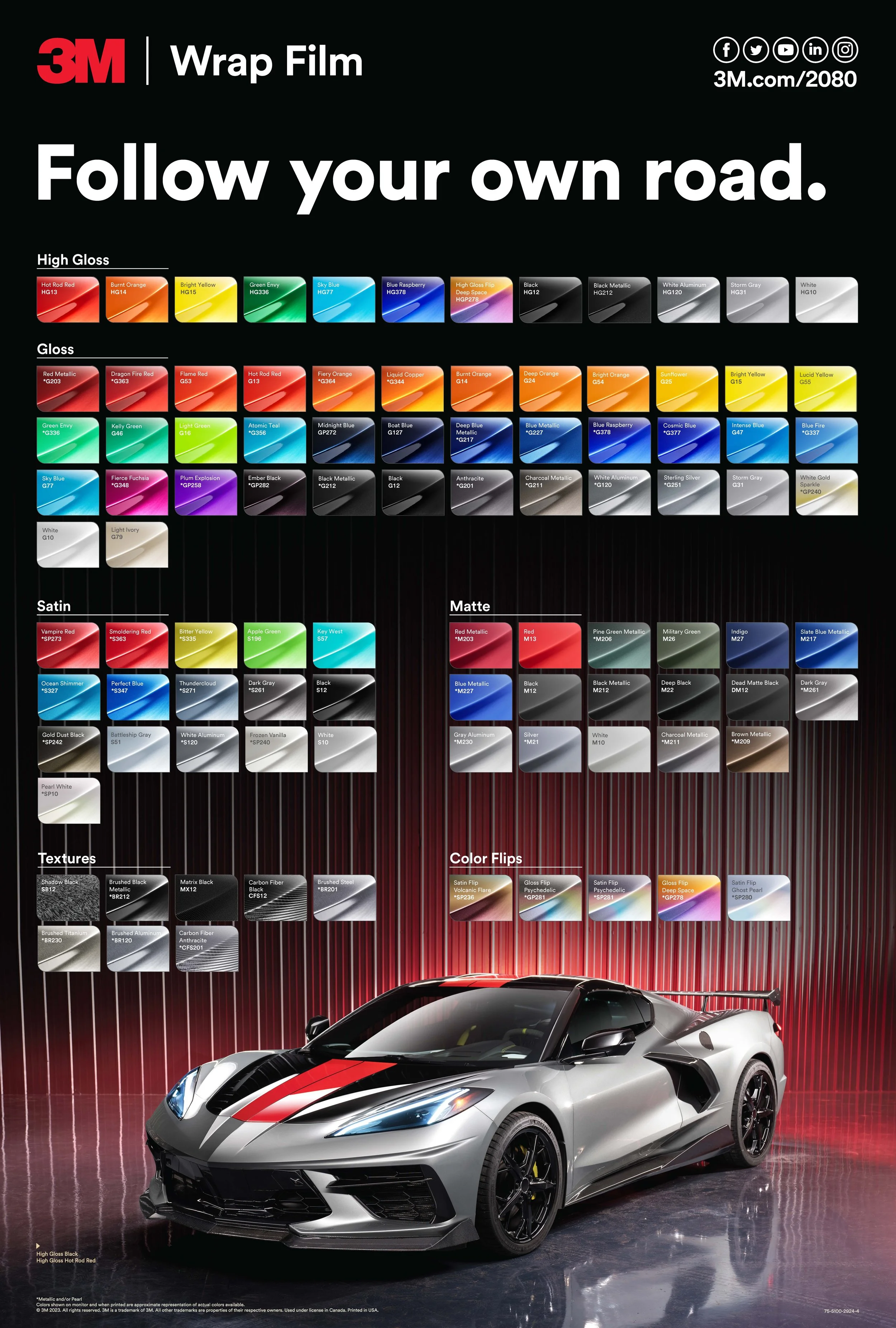2080 Wrap filmThis flyer was designed to showcase the full range of 3M Wrap Films while capturing the bold, expressive personality of the product. Built to both inform and inspire, the design highlights color variety and finish options through strong visuals, clean structure, and high-impact typography. The goal was to create a piece that not only communicates the offering clearly, but also reflects the creativity and customization that define the wrap film experience.